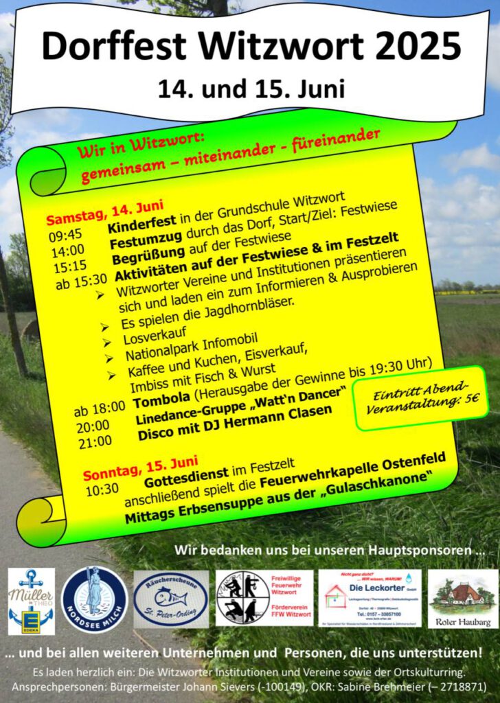 Dorffest Witzwort 2025 Veröffentlicht: 05.06.2025 Das Dorffest findet am 14. und 15. Juni 2025 statt.