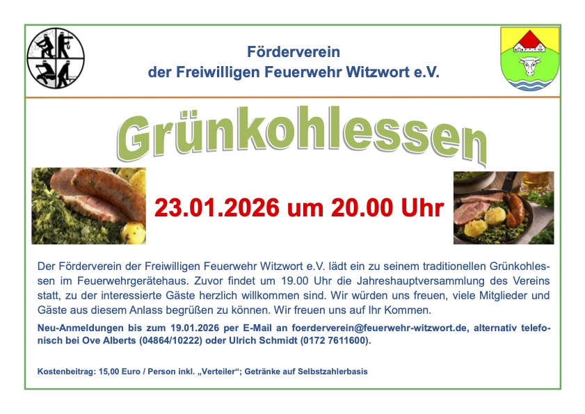 Für die Teilnahme am Grünkohlessen ist eine Anmeldung erforderlich. Um Anmeldung wird bis 19.1.26 gebeten unter foerderverein@feuerwehr-witzwort.de, alternativ telefonisch bei Ove Alberts (04864/10222) oder Ulrich Schmidt (0172 7611600).